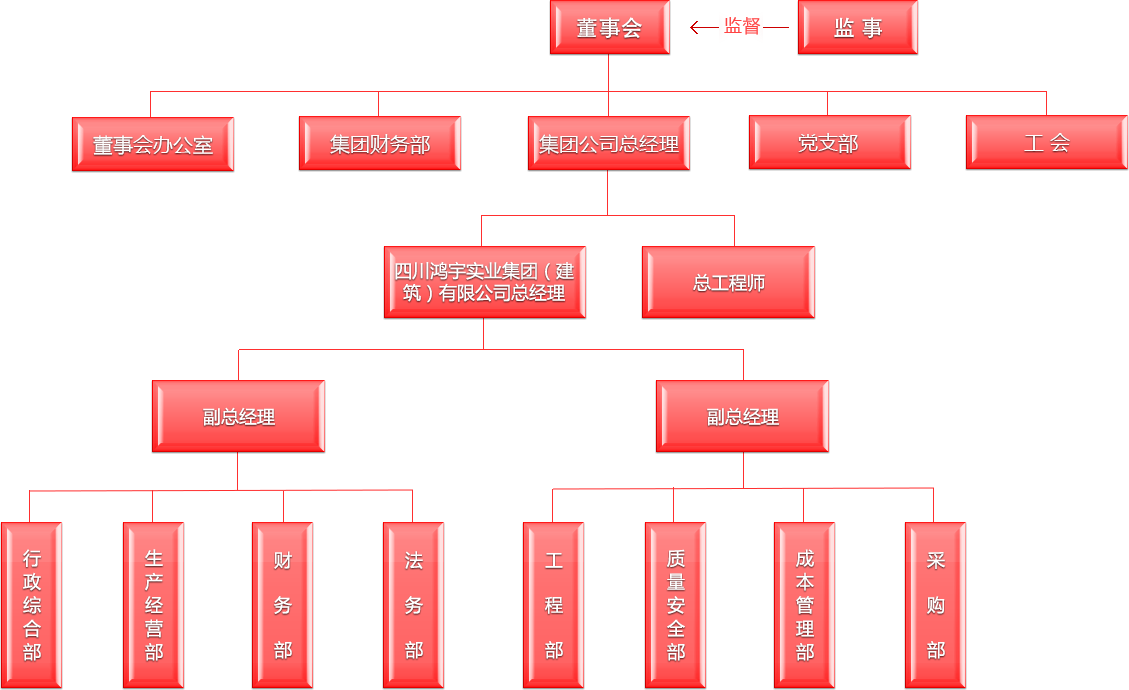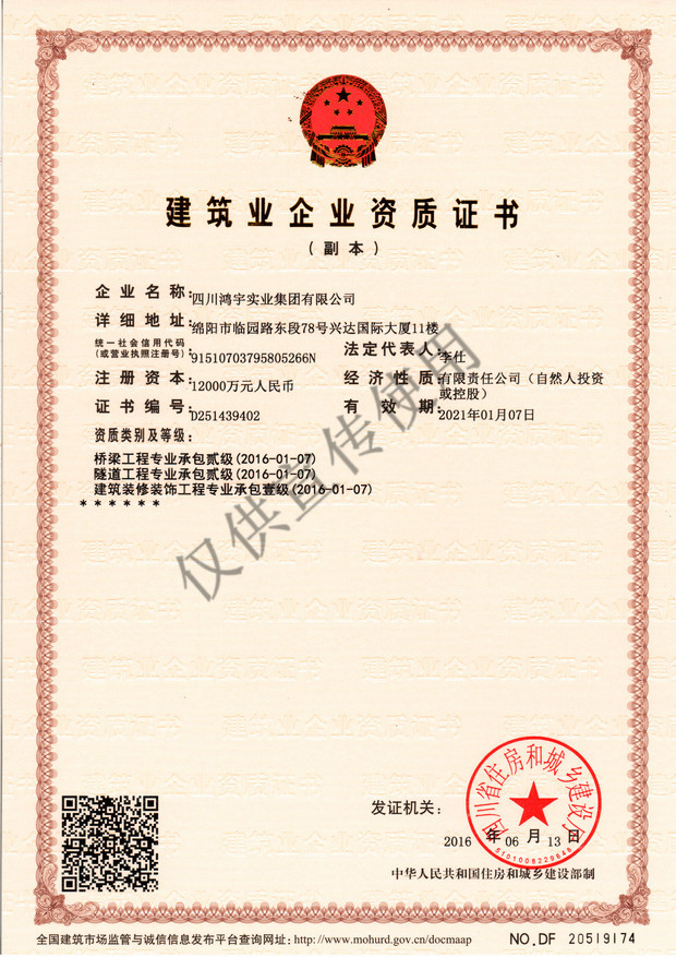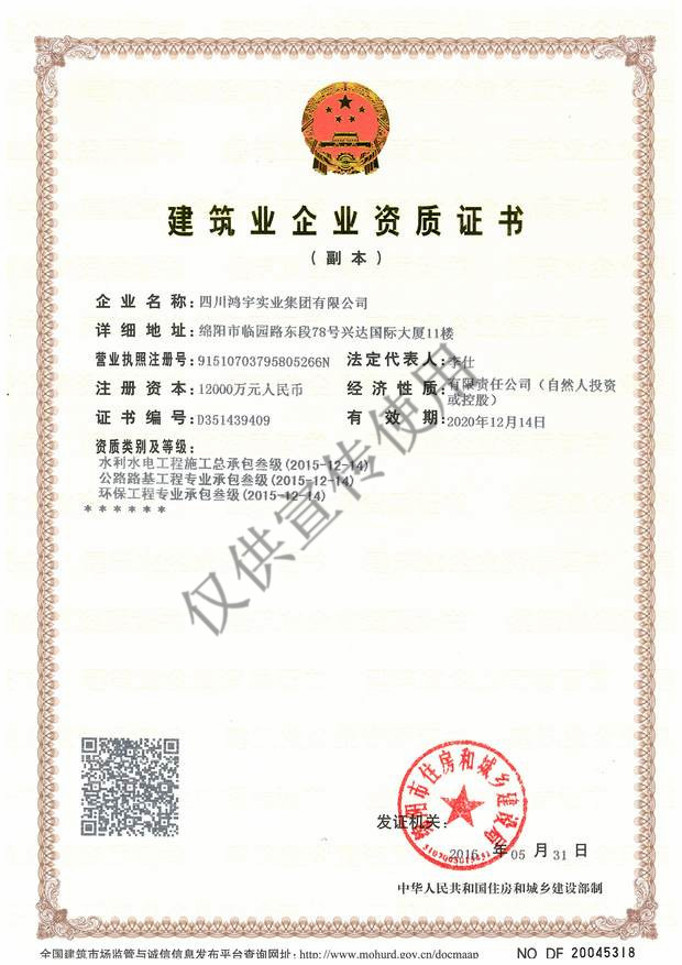 近年来,公司坚持以市场为导向,根据社会需求提供独具特色的高质量产品,先后完成各类房屋建筑、装饰装修、桥梁水利、市政建设等工程100余项,其代表工程有鸿宇商业广场、鸿宇中心、科技城电梯产业园、郁金香生活广场、建设银行综合楼、成都教育学院教学大楼、盐亭县世行贷款一期、二期项目、盐亭县嫘祖大道等。工程合格率100%,履约率100%,优良率93%,满意率96%。公司目前正在着力打造绵阳市游仙区东津路8号棚户区改造项目,并与蓝城集团合作在绵阳市涪城区杨家镇共同打造中国(绵阳)国际康养小镇。